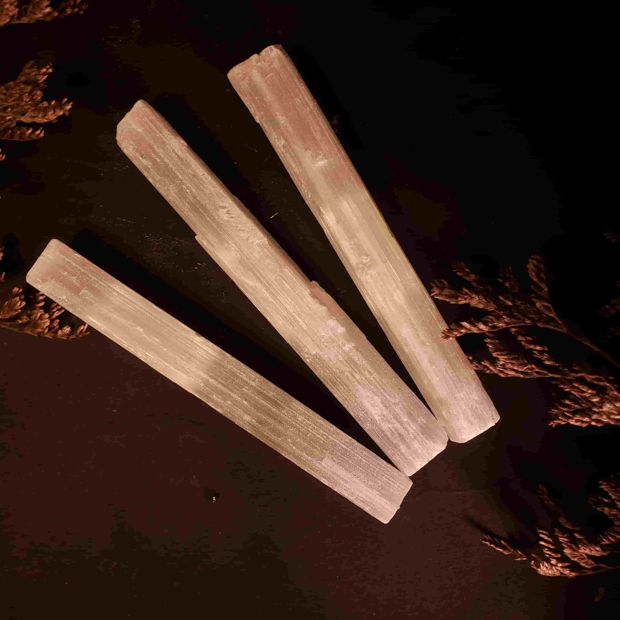 Selenita en barras de 10 cm, piedra para purificación, claridad mental y conexión espiritual, ideal para meditación, altares y armonización de espacios.